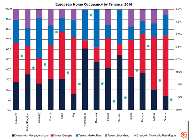 Σε συγκεντρωτικό επίπεδο, αυτή φαίνεται να είναι μία λογική εικόνα της αγοράς. Ωστόσο, ως συνήθως, κατά την εξέταση των λεπτομερειών των μεμονωμένων χωρών, υπάρχουν μεγάλες αποκλίσεις στη σύνθεση των επιμέρους χωρών, η πλειοψηφία των οποίων έχει δει μείωση των ποσοστών ιδιοκτησίας (υποθηκευμένη ή ολική). Ωστόσο, υπάρχουν τρεις αξιοσημείωτες εξαιρέσεις: η Πορτογαλία με αύξηση κατά 0,6%, η Γαλλία με αύξηση κατά 1,2%. και η Ολλανδία με αύξηση 1,8%.