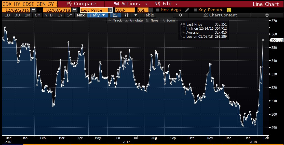 P.P.S. – one facet of market selloffs is contagion. And this comes from investors reassessing risk. With people suggesting too many investors were effectively short volatility, many without even knowing it, investors are checking their portfolios for other signs of potential risk. One risk is in the form of ‘fake liquidity’ provided by ETFs for illiquid underlying markets like high yield bonds or leveraged loans. So far, contagion into markets like these has been limited. The uptick in implied spreads in high yield CDS is one sign, though, that contagion risk is rising.