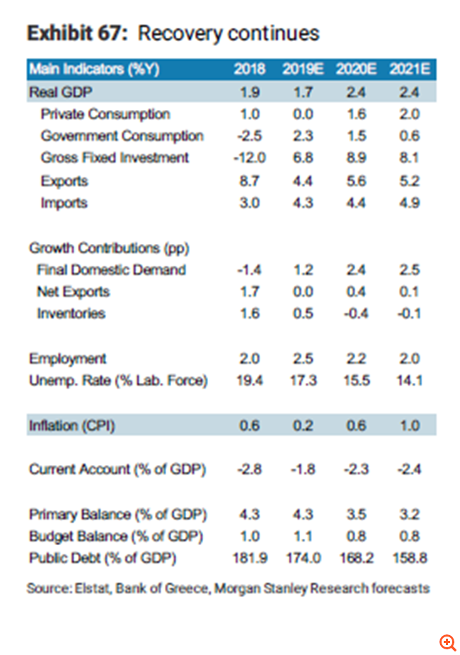 Παρόλο που η ασθενής ανάπτυξη στην υπόλοιπη Ευρώπη είναι ένας κίνδυνος για την ελληνική οικονομία, ωστόσο η εγχώρια ανάκαμψη μπορεί να αποδειχθεί ισχυρότερη από ό,τι εκτιμά η Morgan Stanley. Επίσης, δεν υπάρχουν σημαντικοί πολιτικοί κίνδυνοι. Οι ελληνικές προεδρικές εκλογές στις αρχές του 2020 θα μπορούσαν να αποτελέσουν κάποιο ρίσκο, ωστόσο η M.S εκτιμά πως όπως και να έχει θα αποφευχθεί η διάλυση του κοινοβουλίου.