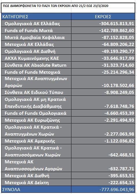Κυριευμένοι από τον πανικό που είναι διάχυτος σε όλες τις αγορές, οι Έλληνες μεριδιούχοι προχώρησαν σε επιθετικές ρευστοποιήσεις με συνέπεια οι εκροές από τα Αμοιβαία να έχουν φτάσει στα 777,7 εκατ. ευρώ, σε χρονικό διάστημα ενός μήνα. Δηλαδή από τις 21 Φεβρουαρίου έως και την περασμένη Παρασκευή 23 Μαρτίου. Στο ίδιο αυτό διάστημα το ενεργητικό για τα συνολικά 338 Αμοιβαία των ελληνικών ΑΕΔΑΚ, έχει μειωθεί κατά 2,3 δισ. ευρώ. Και τούτο γιατί από τα 8,478 δισ. ευρώ που ήταν πριν από περίπου τέσσερις εβδομάδες, έχει καταπέσει τώρα στα 6,179 δισ. ευρώ.