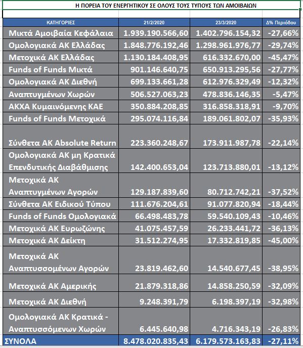 «Λουτρό αίματος» και στην ελληνική αγορά των Αμοιβαίων Κεφαλαίων έχει προκαλέσει η καθίζηση των αποτιμήσεων όλων των επενδυτικών επιλογών, κάτω από τη βαριά σκιά του φονικού κορονοϊού.