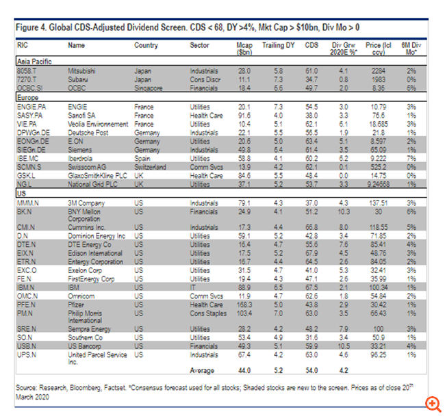 Με βάση τα παραπάνω κριτήρια, η αμερικάνικη τράπεζα καταλήγει σε 30 μετοχές οι οποίες προσφέρουν μέση μετριαστική απόδοση 5,2%, σε σύγκριση με το 1% που είναι η απόδοση στα 10ετή αμερικάνικα ομόλογα. Προς το παρόν, σημειώνει, προβλέπεται ότι τα μερίσματα θα αυξηθούν κατά 4,2% το 2020, ενώ το μέσο spread των CDS διαμορφώνεται στις 54 μ.β. Επιπλέον, όπως τονίζει, ο κλάδος που εμφανίζει να έχει τα πιο ισχυρά μεγέθη με βάση αυτά τα κριτήρια είναι ο κλάδος των υπηρεσιών κοινής ωφέλειας.