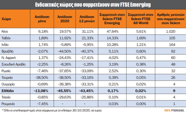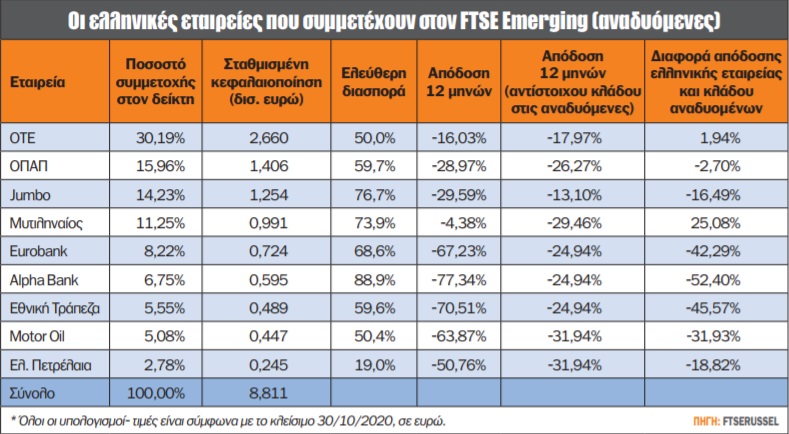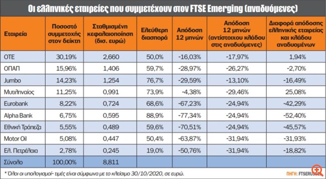 Οι ελληνικές εταιρείες, καθώς και οι σταθμίσεις οι οποίες διαμορφώνουν τον ελληνικό δείκτη που συμμετέχει στον FTSE Emerging (δείκτη τον οποίο συμμετέχει η Ελλάδα), διαμορφώνονται ως εξής: ΟΤΕ (30,19%), ΟΠΑΠ (15,96%), Jumbo (14,23%), Μυτιληναίος (11,25%), Eurobank (8,22%), Alpha Bank (6,75%), Εθνική Τράπεζα (5,55%), Motor Oil (5,08%) και Ελληνικά Πετρέλαια (2,78%). Η Ελλάδα στις 30 Οκτωβρίου 2020 (ημερομηνία που λαμβάνει υπ’ όψιν του ο οίκος FTSE για την αναθεώρηση των δεικτών) κατέχει το αρνητικό ρεκόρ απωλειών τόσο σε επίπεδο 12μήνου όσο και σε επίπεδο από την αρχή του έτους, με -43,45% και -45,55% αντίστοιχα. Για να είμαστε δίκαιοι σε αυτό, δεν πρέπει να ξεχνάμε την περυσινή απόδοση της ελληνικής αγοράς, που άγγιξε το +50%. Οι αποδόσεις που αναφέρονται στους πίνακες αφορούν όχι το σύνολο της ελληνικής αγοράς, αλλά τον δείκτη που σχηματίζουν οι αναφερόμενες μετοχές, καθώς, βέβαια, το ίδιο συμβαίνει και με τις υπόλοιπες χώρες.