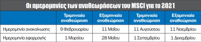 Στις 10 Νοεμβρίου αργά το βράδυ ο οίκος MSCI ανακοίνωσε την εξαμηνιαία αναθεώρηση των δεικτών του. H Motor Oil θα διαγραφεί από τον δείκτη και θα εισέλθει στον MSCI Small Cap (μικρής κεφαλαιοποίησης) μαζί με τα Ελληνικά Πετρέλαια, ενώ ο Μυτιληναίος τελικά δεν θα εισέλθει. Επιπλέον, τα Ελληνικά Χρηματιστήρια διαγράφονται από τον MSCI Small Cap. Υπενθυμίζεται ότι οι μετοχές που απομένουν στο MSCI Standard Index μετά και τη διαγραφή της Motor Oil είναι μόλις τρεις: 1) ΟΤΕ, 2) Jumbo, 3) ΟΠΑΠ. Οι αλλαγές θα εφαρμοστούν την 1η Δεκεμβρίου 2020.