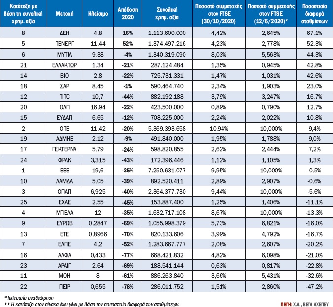Ολοκληρώνοντας, σε ό,τι αφορά τη συμμετοχή των επιμέρους εταιρειών στον δείκτη, αξιοσημείωτη είναι η υποχώρηση του τραπεζικού κλάδου, καθώς η συμμετοχή του συρρικνώθηκε στο 16%, έναντι 20,6% τον περασμένο Ιούνιο. Υπενθυμίζεται ότι ο τραπεζικός κλάδος είχε ευνοηθεί από την εφαρμογή του capping factor, με τις τράπεζες να αυξάνουν τη συμμετοχή τους κατά περίπου 5 ποσοστιαίες μονάδες. Να επαναλάβω ότι οι σταθμίσεις θα οριστικοποιηθούν στις 11 Δεκεμβρίου 2020. Τέλος, οι εταιρείες ΔΕΗ (+67,1%), ΤΕΝΕΡΓΑ (+52,3%) και Μυτιληναίος (+44,3%) είναι οι εταιρείες με τη μεγαλύτερη αύξηση στη συμμετοχή τους στον FTSE Large Cap, ενώ τη μεγαλύτερη συρρίκνωση σημειώνουν οι μετοχές των Τράπεζας Πειραιώς (-47,2%), Motor Oil (-32,6%) και Aegean Airlines (-22,8%).