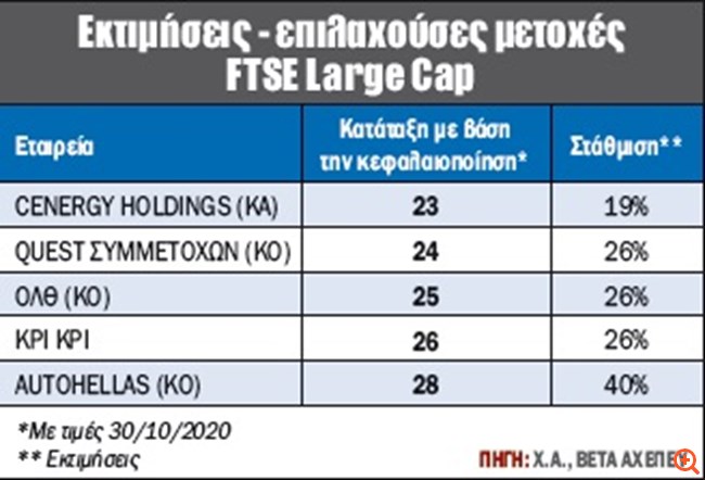Ταυτόχρονα και σύμφωνα πάντα με τις εκτιμήσεις, οι 5 επιλαχούσες μετοχές για την εισαγωγή τους στον FTSE Large Cap είναι οι Cenergy Holding, Quest, ΟΛΘ, Κρι Κρι και Autohellas. Υπενθυμίζεται ότι στην προηγούμενη αναθεώρηση η πεντάδα ήταν: Quest, Autohellas, ΟΛΘ, Cenergy Holding και Ιασώ. Ωστόσο, το Ιασώ εκτιμάται ότι δεν καλύπτει το κριτήριο της εμπορευσιμότητας και δεν θα βρίσκεται μέσα στην πεντάδα της επικείμενης αναθεώρησης.
