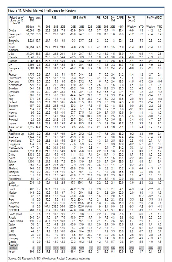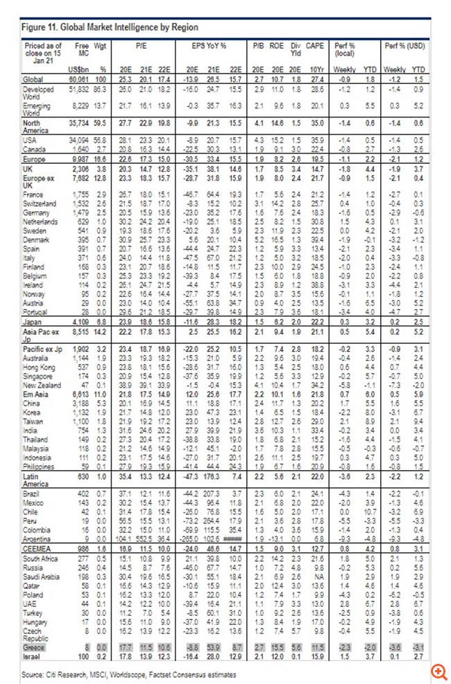 Η Citi παραδέχεται πως δεν περίμενε ότι οι παγκόσμιες μετοχές θα ανακάμψουν τόσο έντονα πέρυσι. Οι τιμές των μετοχών έχουν αυξηθεί ακόμη και εν μέσω πτώσης των κερδών ανά μετοχή. Ο δείκτης Panic / Euphoria ( πανικού/ευφορίας των αγορών) της Citi βρίσκεται σε ιστορικά υψηλό επίπεδο ευφορίας.