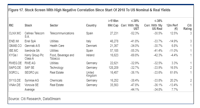 Οι ευρωπαϊκοί κλάδοι των τραπεζών, των αυτοκινήτων, των ασφαλειών, των ταξιδιών και της αναψυχής καθώς και της ενέργειας έχουν την υψηλότερη θετική συσχέτιση, δηλαδή τείνουν να υπεραποδίδουν όταν αυξάνονται οι αποδόσεις των ομολόγων. Η υγεία, η προσωπική φροντίδα, οι υπηρεσίες κοινής ωφέλειας και τα τρόφιμα και ποτά, έχουν τις υψηλότερες αρνητικές συσχετίσεις. Συνολικά, οι κυκλικοί κλάδοι τείνουν να υπεραποδίδουν των αμυντικών όταν οι αποδόσεις των ομολόγων κινούνται υψηλότερα, όπως καταλήγει η Citi.