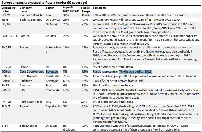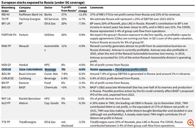 Συγκεκριμένα, οι ευρωπαϊκές εταιρείες και το ποσοστό τον κερδών τους που προέρχονται από τη Ρωσία είναι οι εξής (μεταξύ των οποίων και η Coca-Cola Hellenic): Raiffeisen Bank (37%), Technip Energies (25%), BP (20%), Fortum (20%), Renault (11%), Henkel (8%), Coca-Cola Hellenic (7%), Buzzi Unicem (7-8%), Carlsberg (6-8%), Danone ( 6%), BASF (,5%), Reckitt Benckiser (5%), Alstom (5%) και TotalEnergies (κατέχει το 20% της Novatek, συν LNG στη Ρωσία)