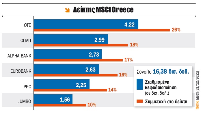 Η ελληνική χρηματιστηριακή αγορά παραμένει μια μικρή περιφερειακή αγορά μέσα στον παγκόσμιο χάρτη, όμως οι μεγάλες αποδόσεις είναι αυτές που προσελκύουν ξένους επενδυτές. Ο δείκτης που έχουν ως οδηγό οι αλλοδαποί επενδυτές για την Ελλάδα είναι ο MSCI. Υπενθυμίζεται ότι οι μετοχές που συμμετέχουν στον δείκτη, με τον ΟΤΕ να έχει τη μεγαλύτερη στάθμιση και την Jumbo τη μικρότερη, είναι: 1) OTE, 2) ΟΠΑΠ, 3) Alpha Bank, 4) Eurobank,, 5) ΔΕΗ, 6) Jumbo.