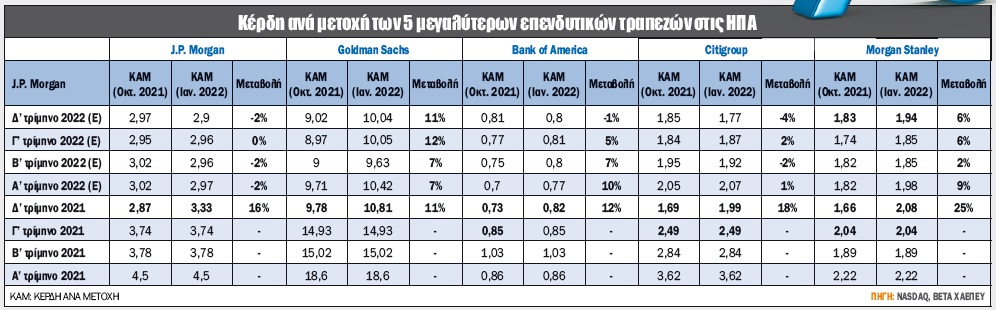 Πριν από μερικές ημέρες οι μεγαλύτερες επενδυτικές τράπεζες του πλανήτη ανακοίνωσαν οικονομικά αποτελέσματα δ’ τριμήνου / 12μήνου 2021. Τα κέρδη ανά μετοχή που ανακοίνωσαν οι 4 από 5 ξεπέρασαν τις εκτιμήσεις της αγοράς, με την Goldman Sachs να "χάνει" τις εκτιμήσεις της αγοράς. Ωστόσο, οι μετοχές των τραπεζών, παρά το γεγονός ότι ξεπέρασαν τις εκτιμήσεις, υποχώρησαν σημαντικά, καταγράφοντας διψήφιες απώλειες τις επόμενες ημέρες.